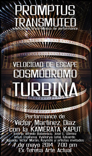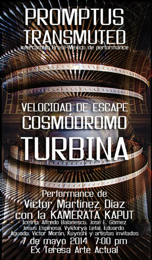 Acción presentada en el Intercambio de performance Brasil México PROMPTUS en su versión mexicana en el Ex Teresa Arte Actual. Planteada como una respuesta a la versión brasileña de "Velocidad de Escape", el cosmódromo turbina plantea un dispositivo radial, a diferencia del dispositivo lineal de la versión brasileña.
