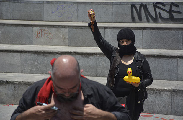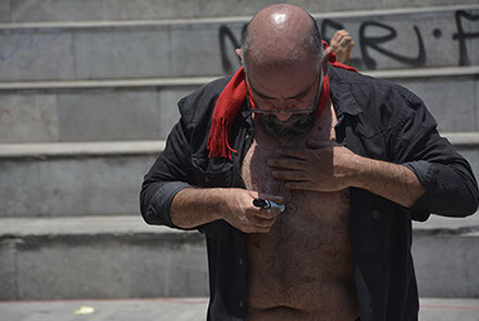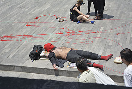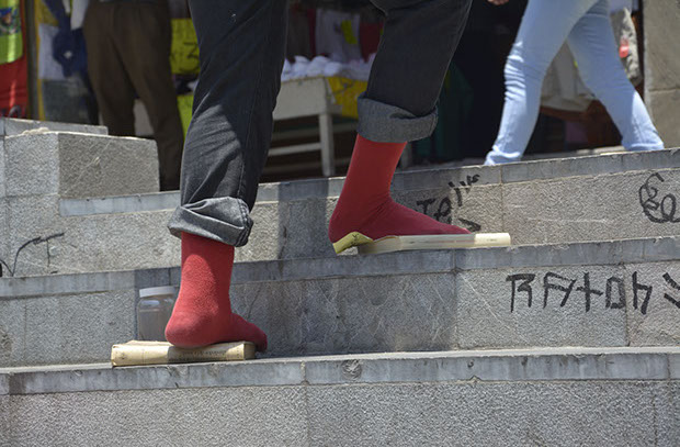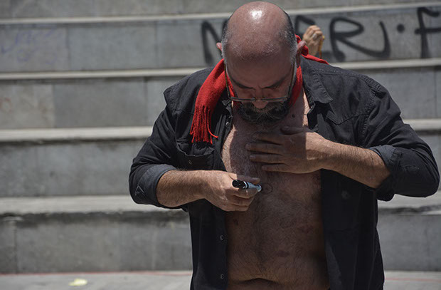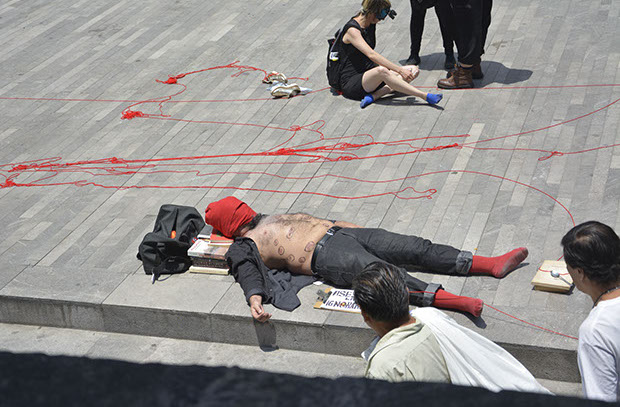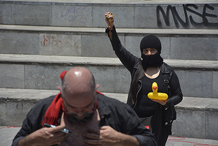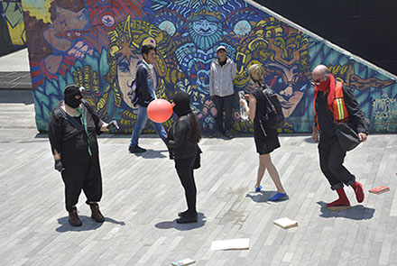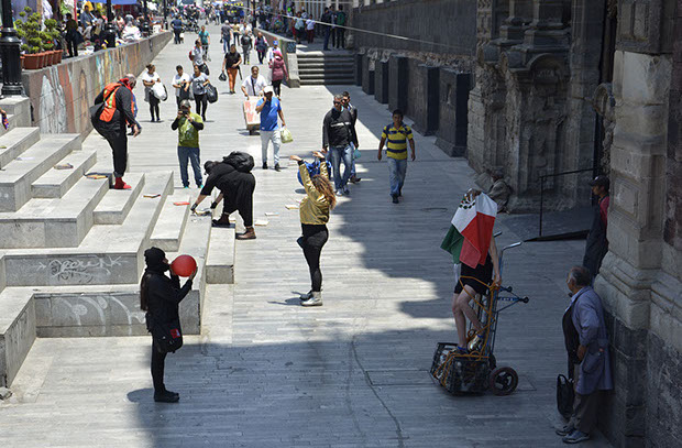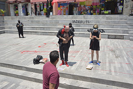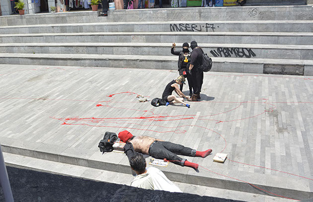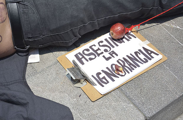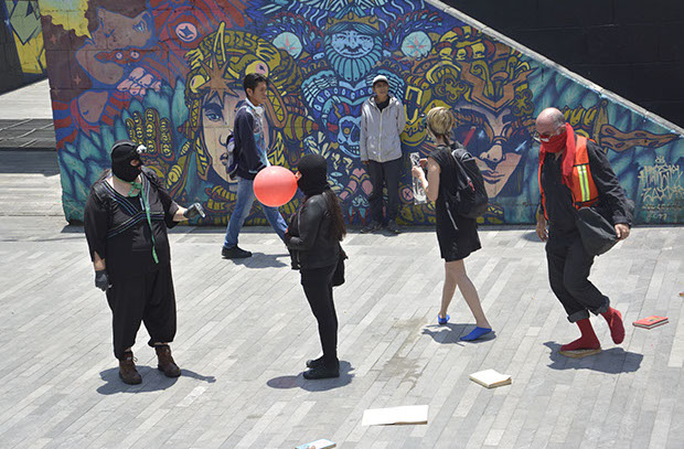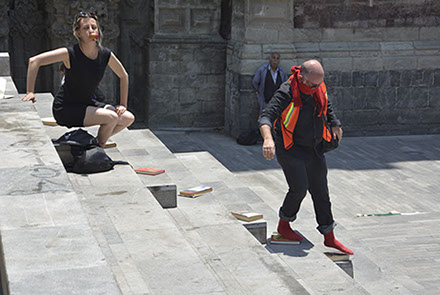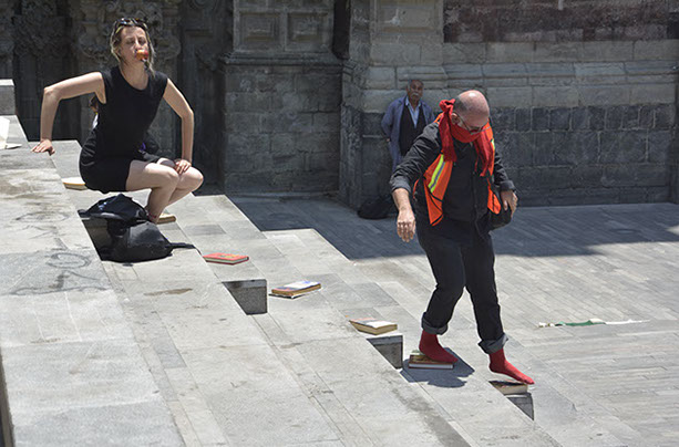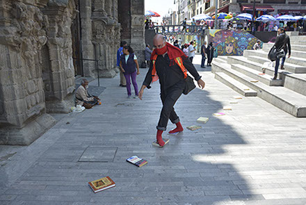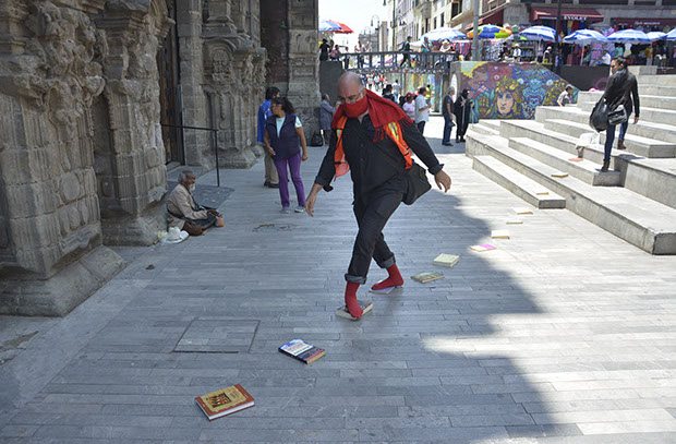 Tiempo atrás había soñado cruzar el zócalo caminando sobre libros, como si fueran rocas en un río o piedras en un malpaís de lava; son piedras de sentido, cápsulas de la voz humana que se expande y se perpetúa, información que se accede con la mirada, nos programay nos hace avanzar en el tiempo y la supervivencia. Elijo diez libros al azar que servirán de escalones para una trayectoria con crestas y valles. El ultimo libro debe ser el primero en cada paso, por tanto debo ir y regresar en cada construcción de futuro. En el trayecto encuentro a mis compañeras que interactúan conmigo y el dispositivo, así como algunas personas intrigadas por el acto, complementamos nuestros discursos en medio de reacciones intensas de parte de personas que operan con los simbolos con una religiosidad peligrosa, traspasamos el límite de lo posible con los objetos de la cultura oficial pero la negociación terminó sin escalar a pesar de que el público aprovechó la discrepancia para expresar desde la tribuna su derecho a disentir en lo que suponemos era su lectura de los actos desarrollados en el transcurso del dia. Termino asesinado con mis propias cicatricez expuestas, como expuestos estamos a los malos entendidos y la discordia que revela una lucha de clases sin sentido más que el de dividir y atomizar la revuelta.