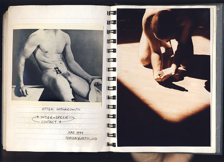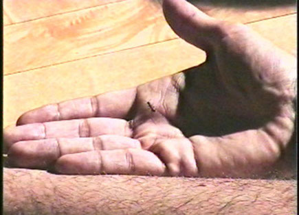 La acción consistió en dejar que una hormiga camine sobre mi cuerpo siempre manteniendo derecha su linea de horizonte, por lo cual mi cuerpo tenía que girar y moverse de acuerdo al trayecto de la hormiga. La hormiga, después de 5 minutos, no se movió más.