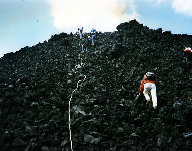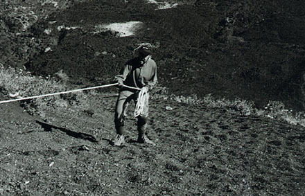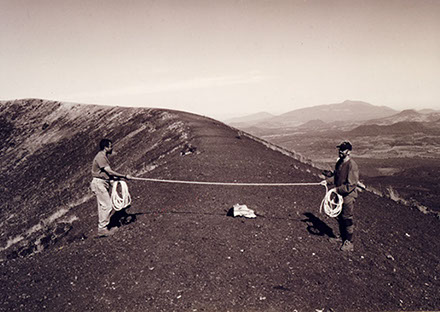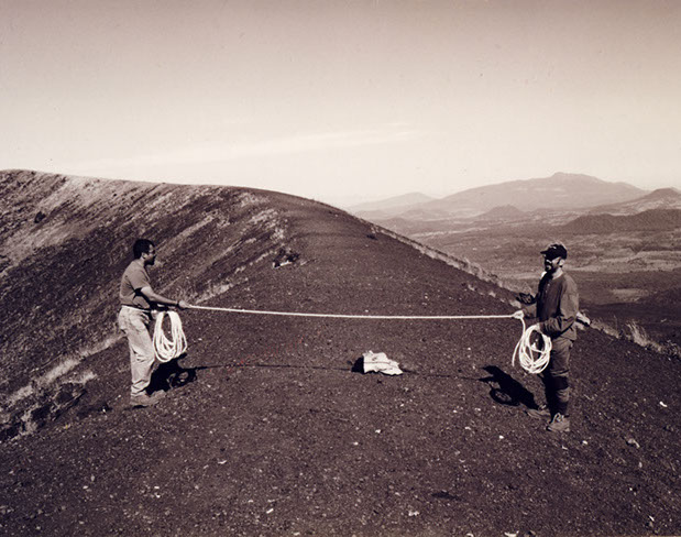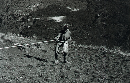 Es un trabajo en colaboración con el artista Sakino, buscando los angulos del volcán nos deslizamos por las laderas del cráter atados a una cuerda, uno hacia adentro y otro hacia el exterior haciendo una especie de descenso en rapel encontrando el equilibrio con el peso del otro y confiando esa resistencia natural.