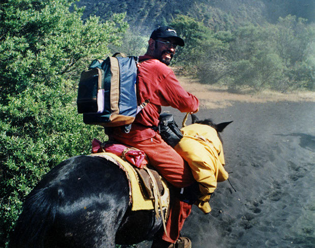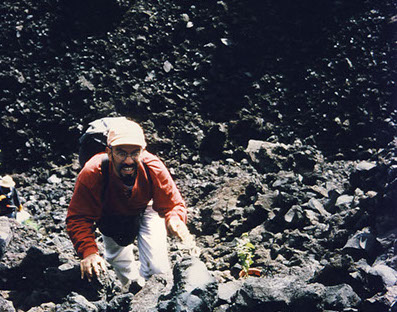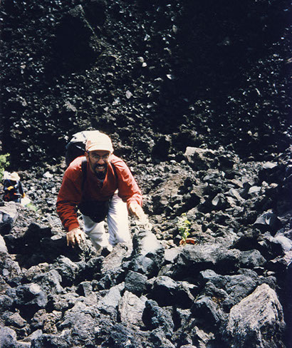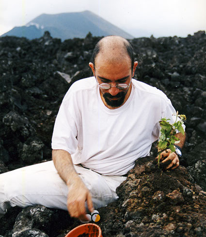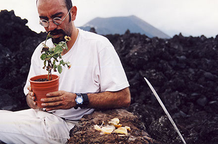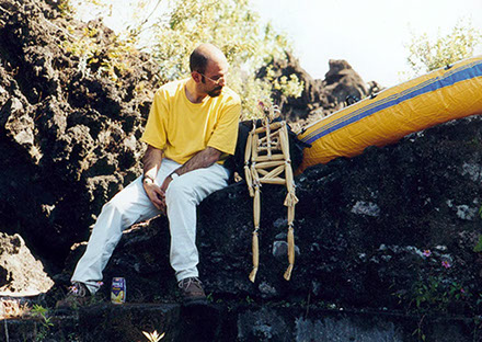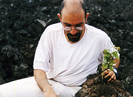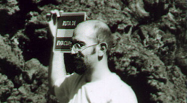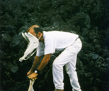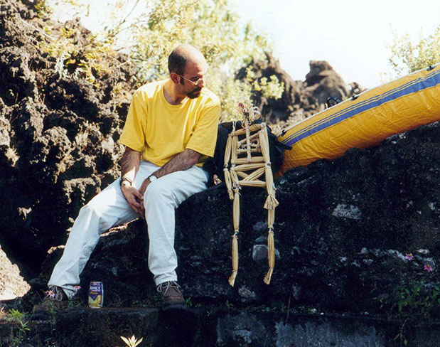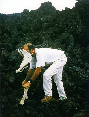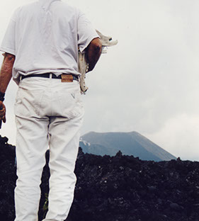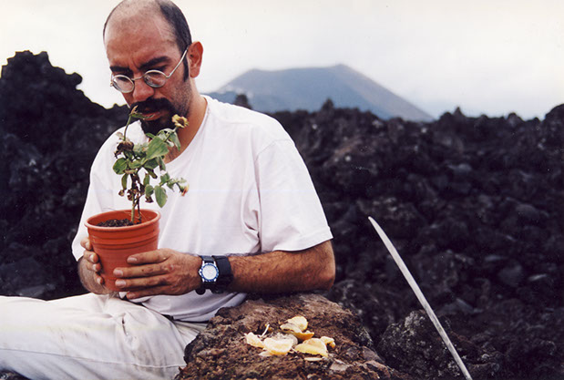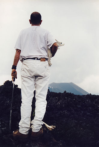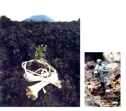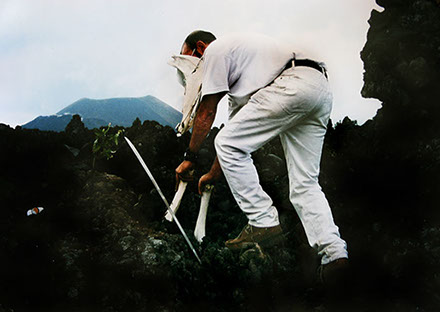 Flor vs Gladiador (caminata en la lava) Es una acción realizada en la primera expedición al mar de lava. El guía sugirió ir a donde nunca antes alguien hubiera pisado. Al llegar a un punto determinado con vista al volcán sembré una flor que traia conmigo a cuestas en las escarpadas laderas, colocando primero todo lo que traia en las bolsas, dinero, gajos y cáscaras de mandarina, una llave, luego pedí a todos "me da un peso ", así como decían los niños del pueblo de Angaguan insistentemente. Luego coloqué un poco de tierra de los volcanes Sta Helena en EU, Vesuvio en Italia y el volcán Merapi de indonesia Sembrada la planta con su inusual abono procedo a hacer códigos binarios con una piedra y un femur de vaca nombrando las inciales de los participantes en morse. Me coloco una quijada de vaca en la cabeza a manera de máscara sin orificios para mirar porque tiene una placa electrónica ensamblada y teclas en vez de muelas. Hago una caminata alrededor del grupo en círculo en 4 patas, tomando dos huesos largos de vaca como muletas que me dan mucho más apoyo que caminando en dos piernas y con la vista descubierta. Regreso a donde la flor plantada, saco un machete y hago una sesión de improvisación sonora del metal sobre las piedras y al terminar monto guardia frente a la flor y mirando al volcán en la misma posición que un pequeño soldado romano de plomo que dispongo frente a la flor.