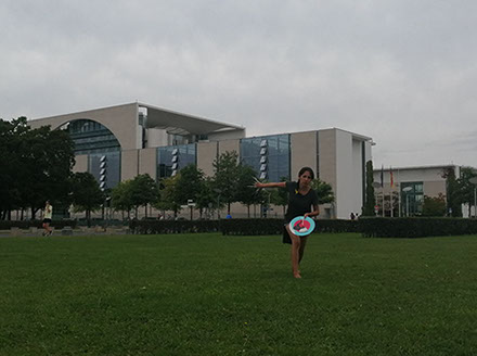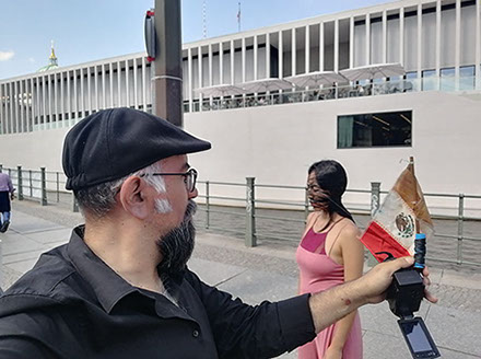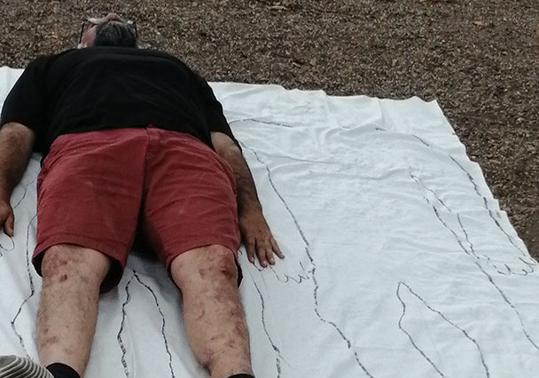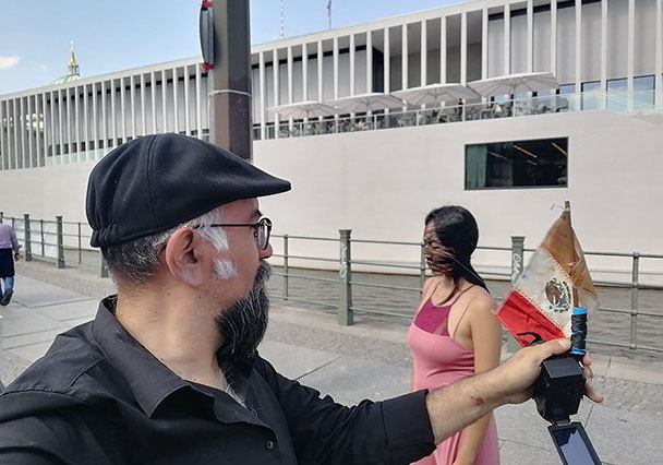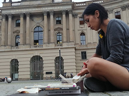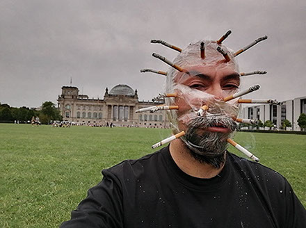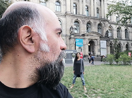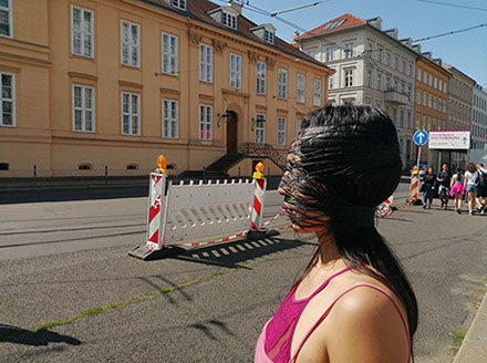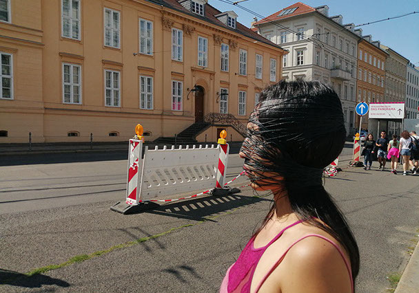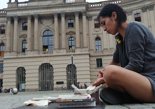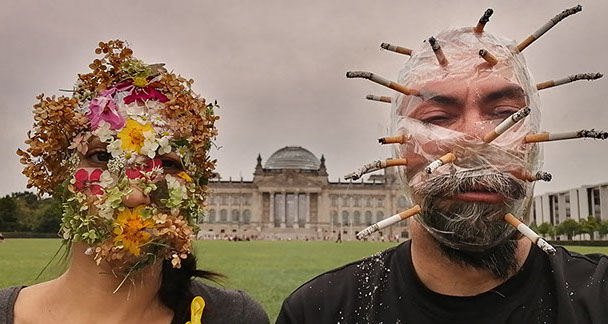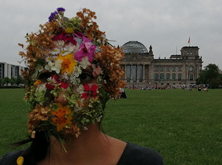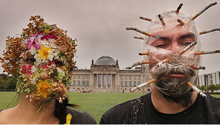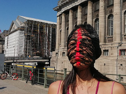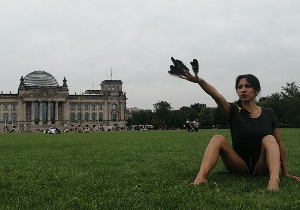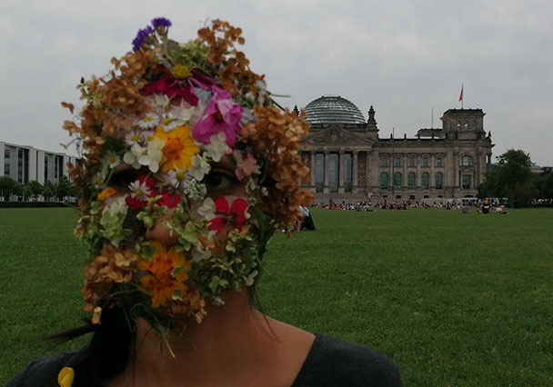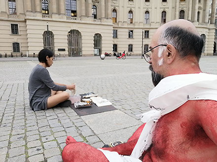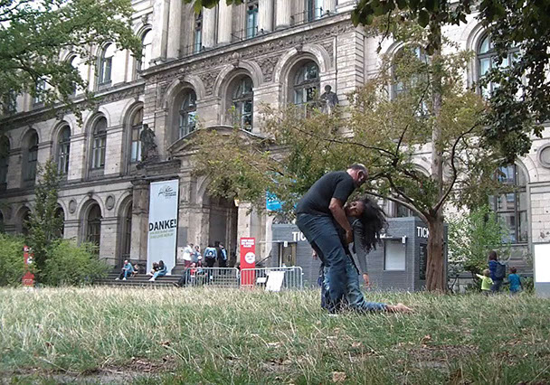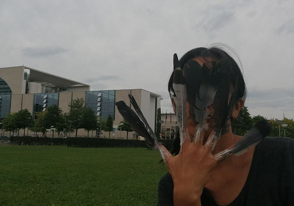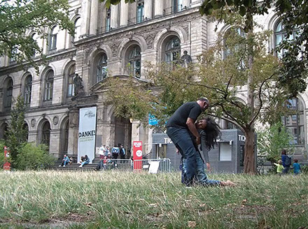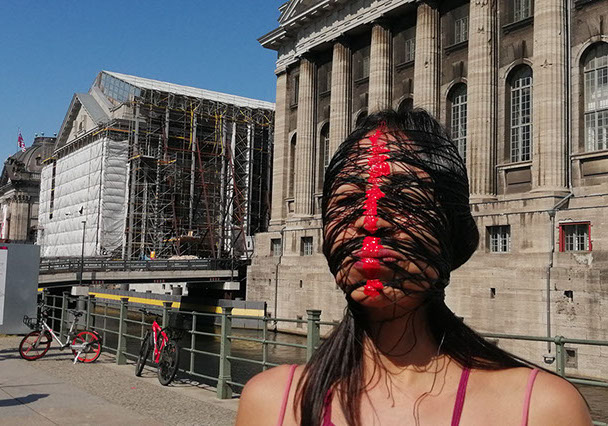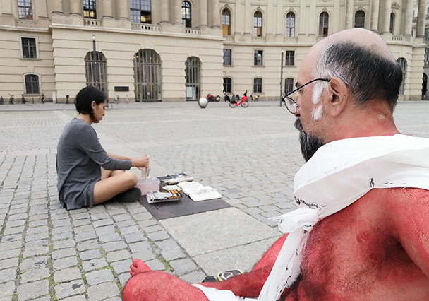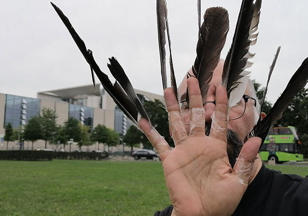 Ejercicios frente al Museo de Historia Natural de Berlín, donde estan a punto de inaugurar una exposición conmemorativa alrededor de la figura de Alexander von Humboldt, sobre la idea de la evolución de Darwin, los individuos, escalando su propia dimensión, en cooperación, ensayo y error para generar aprendizaje. El Museo del Pérgamo, la cultura importada como trofeo, se erige frente a la casa de la primer ministra, donde cualquier actividad es sospechosa, mientras un carrete de hilo que gira en el palo de una bandera se desenrolla para cubrir la cabeza, suplantando la identidad u ocultandola bajo la cinta de peligro de un cuerpo momificado in situ que se lee como inminente protesta.