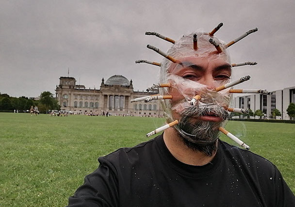 El rostro como soporte de elementos que lo suavizan a la vez que lo desaparecen, o que en un incendio queman todos los cigarros de un paquete al mismo tiempo.