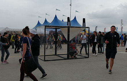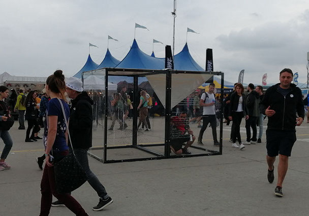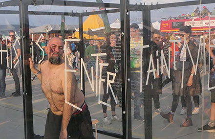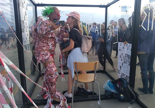Acción de 2 horas en la caja de plexiglass durante el Festival Pohoda 2019 en Trencin, Slovaquia como parte del Festival Internacional de Performance Transart Communication organizado por HALA y Kassak Centre. Curaduría Paola Paz Yee, organización y dirección Rokko Juhasz.