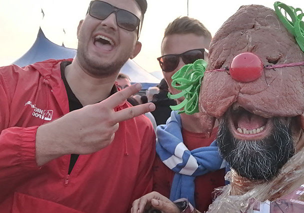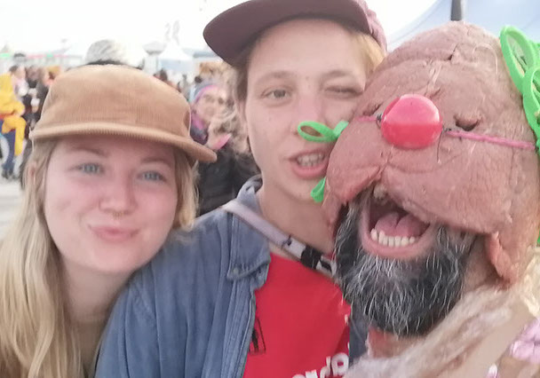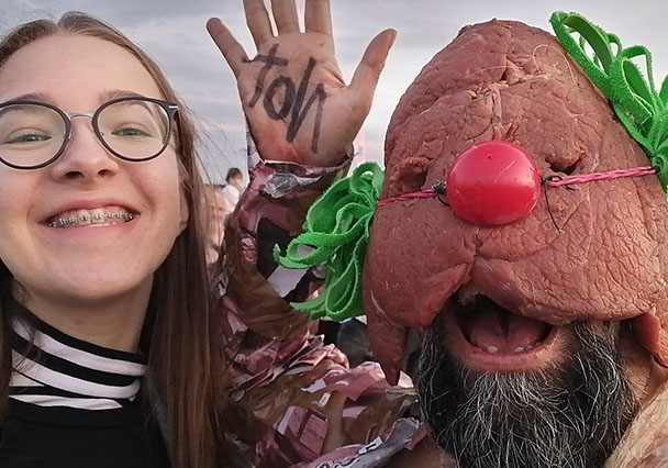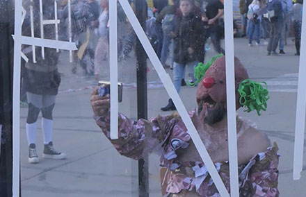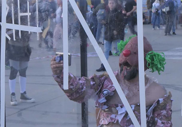 El Festival Transart Communication se desarrolla en contextos singulares para la acción. En este caso, el performance Box propone realizar la acción durante dos horas en una caja-vitrina en medio de un festival de música muy popular al que asiste por 3 dias gente de todas las edades. La caja puede estar abierta o cerrada, escogí dejár solo un lado abierto para realizar acciones tanto dentro como fuera, generar un espectro que logra escapar y mezclarse entre la multitud. Las cuatro operaciones de devoración fueron reinterpretadas desde la literalidad de devorar piel humana y carne que suplanta una herida profunda en mi cuerpo (pierna) izquierda), para luego devorar las imágenes de un poster conmemorativo de un archivo de arte contemporáneo, y posteriormente cubrirme con él para ser devorado por las imágenes y más aún, por la transformación de un cuerpo sanginario a un personaje tipo clown con una máscara de carne al estilo luchador. Capas de imágenes se superponen hasta terminar siendo devorados todos por la "selfie" con el payaso de carne.