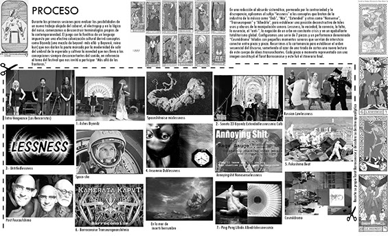 El proyecto Kaput nace con un espíritu revisionista de las prácticas dadaístas y fluxus que adaptamos a nuestro contexto. Entre ellas el montaje gráfico de materiales apropiados en los collages de los programas de mano y fanzines se traduce a la apropiación y montaje en video de colecciones de imágenes icónicas que proponen paradigmas de un imaginario social a una inmersión sonora que resonará de diversas maneras con el material visual.