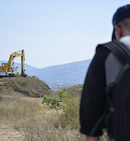 Una máquina es abandonada en el campo de Oaxaca. El rumor de un espíritu interventor tanto en su descompostura como en la suspensión del proyecto que la llevó hasta allí se cierne por las poblaciones aledañas. Una máquina dedicada a arrancar piedras del terreno, a cavar zanjas y transformar el paisaje ha quedado instalada en la cima de un pequeño montículo, como en homenaje a sí misma y sus poderes perdidos. Abandonada en la loma pareciera de lejos ser una torre, un campanario, una iglesia, una cruz, algo que uno esperaría como parte de un paisaje costumbrista pero que al acercarse revela su modernidad implacable suspendida en el tiempo.