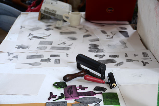 Diversos sellos y estampados realizados por los participantes.