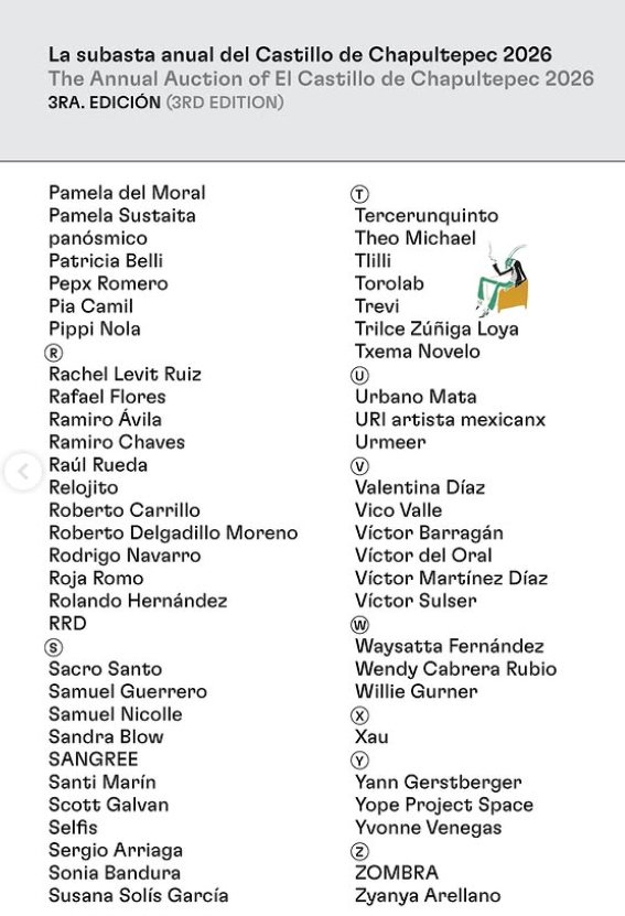 19 Concreto, Eduardo Abaroa, Mariana Botey, Casper, Caxa, Andrea Ferreyra, Grupo Incidental, Melquiades Herrera, Jalarte, Marcus Kurtycz, Los Chinos, Los Lichis, Marcelaygina, Teresa Margolles, César Martínez, Sarah Minter, Taniel Morales, Lorena Orozco, Pinto Mi Raya, Vicente Razo/Museo Salinas, Elvira Santamaría, Semefo, Sonido Apokalitzin, Katia Tirado, Ema Villanueva, Lorena Wolffer